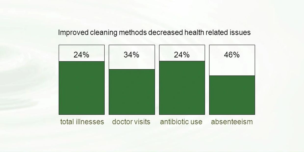 The chart to the right documents significant reductions in total illnesses, doctor visits, antibiotic use, and absenteeism when improved cleaning methods were used.